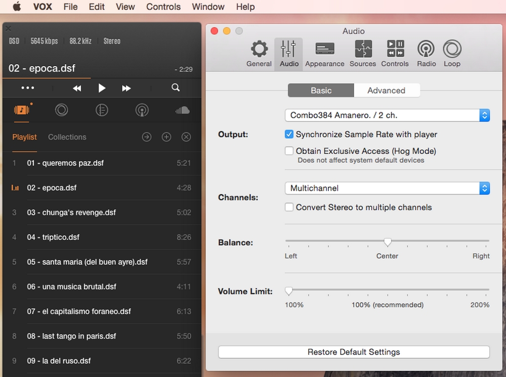 Pour l'Apple et le lecteur de média Vox l'affichage de la fréquence d'échantillonnage réelle doit également être paramétré : ouvrir la fenêtre "Preferences" et cocher à la ligne "Output": "Synchronize Sample Rate with player".