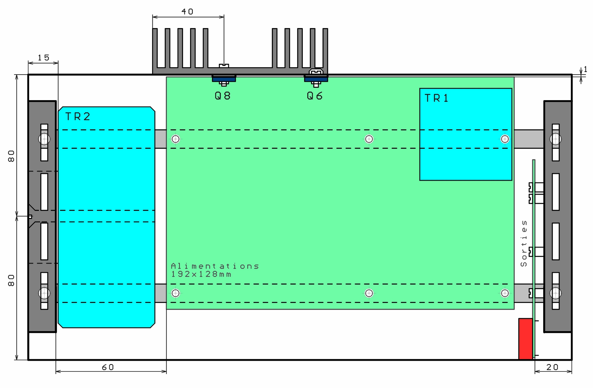 La carte des alimentations est fixée sur deux profilés « U » de 298 mm. Son positionnement n’est pas critique.