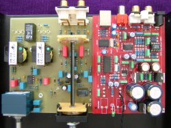 L’embarquement du module DAC nécessite une petite préparation. Les deux commutateurs d’origine sont enlevés ainsi que les deux diodes de redressement. Quatre entretoises plastic de 5 mm sont collées aux quatre coins à l’aide de colle cyanoacrylate. Deux nouvelles diodes sont placées et les queues des composants côté redressé traverseront la carte préampli pour en assurer l’alimentation en + et – 18 Vdc.
