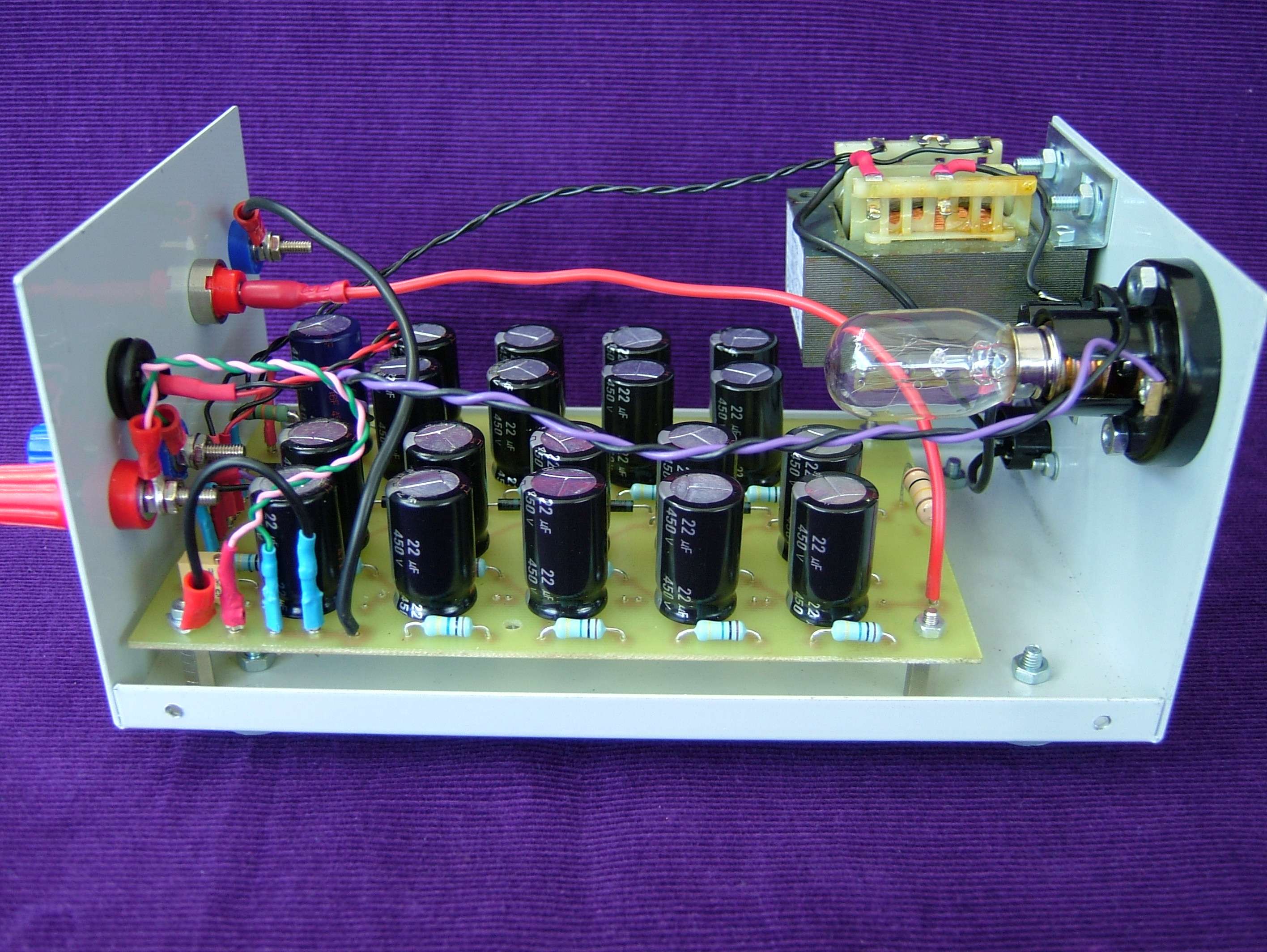 Il est alimenté par une tension alternative à 50 Hz issue d’un transformateur d’isolation de 30 VA lui-même piloté par un auto-transformateur (Variac).